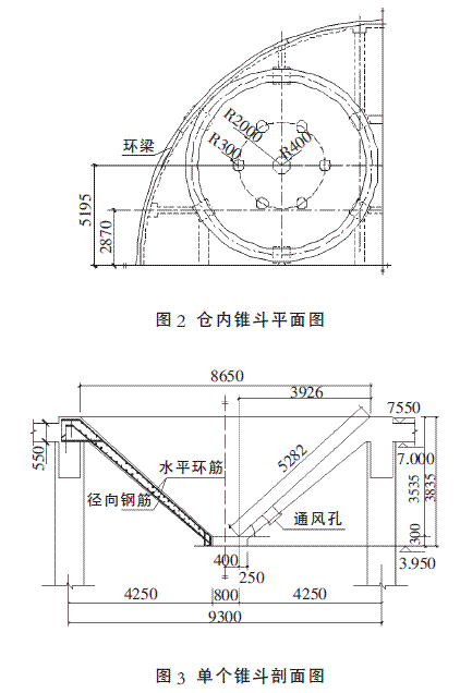 浅圆仓下设计有4 个卸粮锥斗(见图2), 锥斗平台标高为7.550m, 漏斗上、下口半径分别为4650mm、800mm, 锥斗壁厚250~445mm, 漏斗高度3835mm, 锥斗锥度42°, 详见图3。