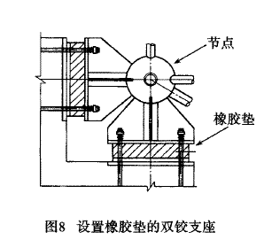 图8 为在预埋件上布置的双铰支座[5],在预埋件和支座之间设置了橡胶垫,具有抗震和减震双重效果。图9 为螺栓球节点及与杆件连接的细部构造。图10 为支撑输送体系的H 型钢梁组合结构布置示意图。可以安全有效的将荷载传递到网壳结构上,而且可保证运输履带循环走动。