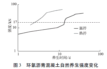 为准确掌握环氧沥青混凝土强度增长情况,确保开放交通有据可依。现场可放置同期成型环氧沥青混凝土试件,与施工完毕的环氧沥青同等条件养生,通过马歇尔试件强度分析现场环氧沥青混凝土强度变化,为开放交通提供依据。